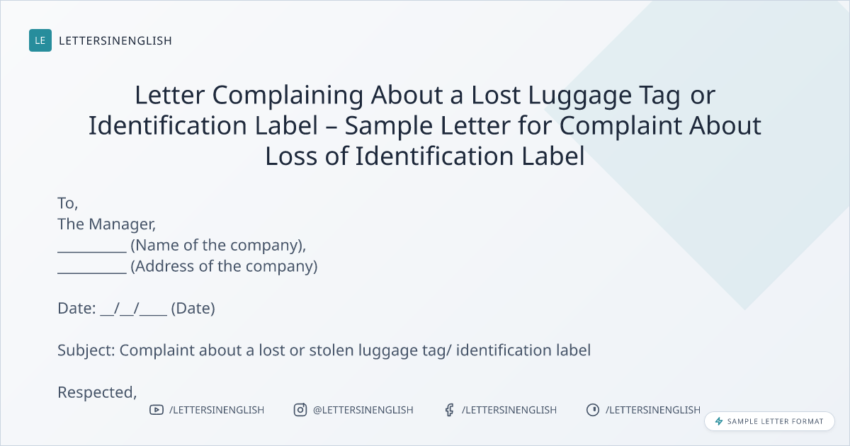 Letter Complaining About a Lost Luggage Tag or Identification Label – Sample Letter for Complaint About Loss of Identification Label