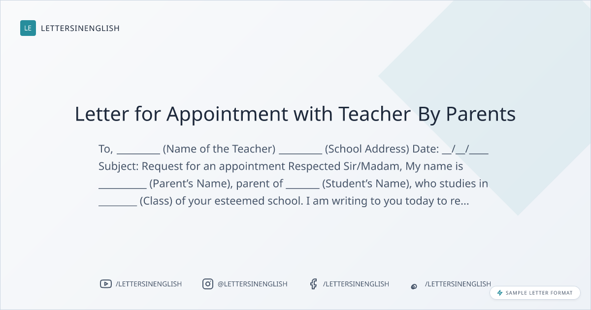 My name is __________(Parent’s Name) Parent of _______ (Student’s Name), who studies in ________ (Class) of your esteemed school. I am writing to you today to request an appointment with you so as to have a discussion regarding __________ (my ward’s performance) and ________ (Mention other reason for having an appointment)