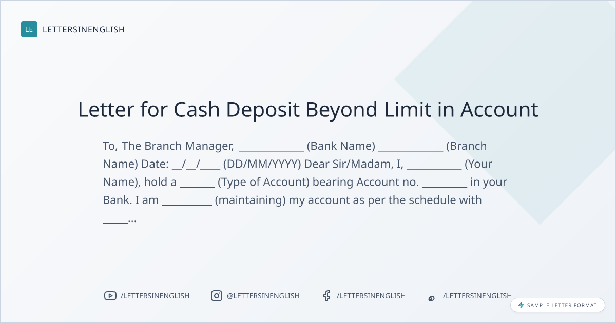 I___________ (Your Name) hold a _______ (Type of Account) bearing Account no. _________ in your Bank. I am __________ (maintaining) account as per schedule with __________ (account scheme details). I am writing this letter to deposit the cash amounting __________ (amount) in my account on _________ (date).