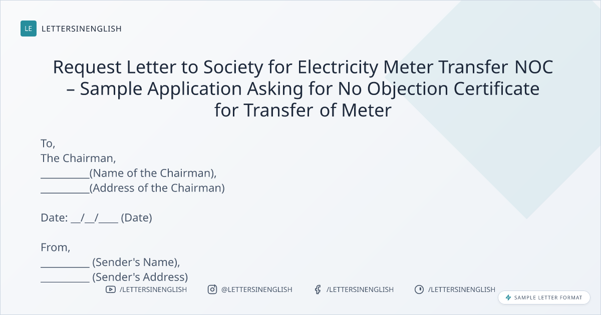 Request Letter to Society for Electricity Meter Transfer NOC – Sample Application Asking for No Objection Certificate for Transfer of Meter