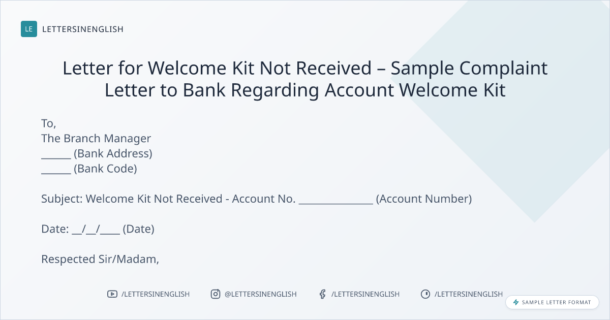 Letter for Welcome Kit Not Received – Sample Complaint Letter to Bank Regarding Account Welcome Kit