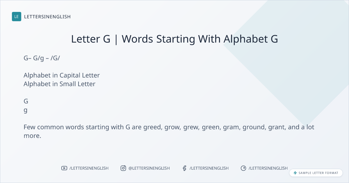 Few common words starting with G are greed, grow, grew, green, gram, ground, grant, and a lot more.