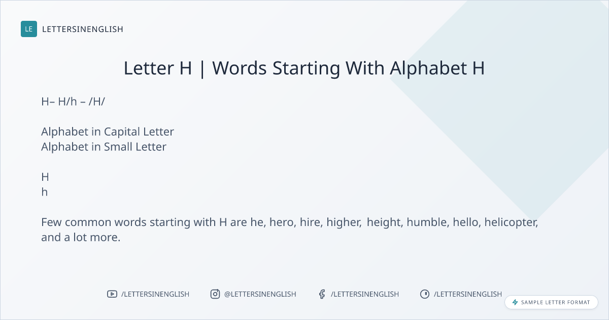 H– H/h – /H/ Alphabet in Capital Letter Alphabet in Small Letter H h Few common words starting with H are he, hero, hire, higher, height, humble, hello, helicopter, and a lot more. Find Some Words Sta...