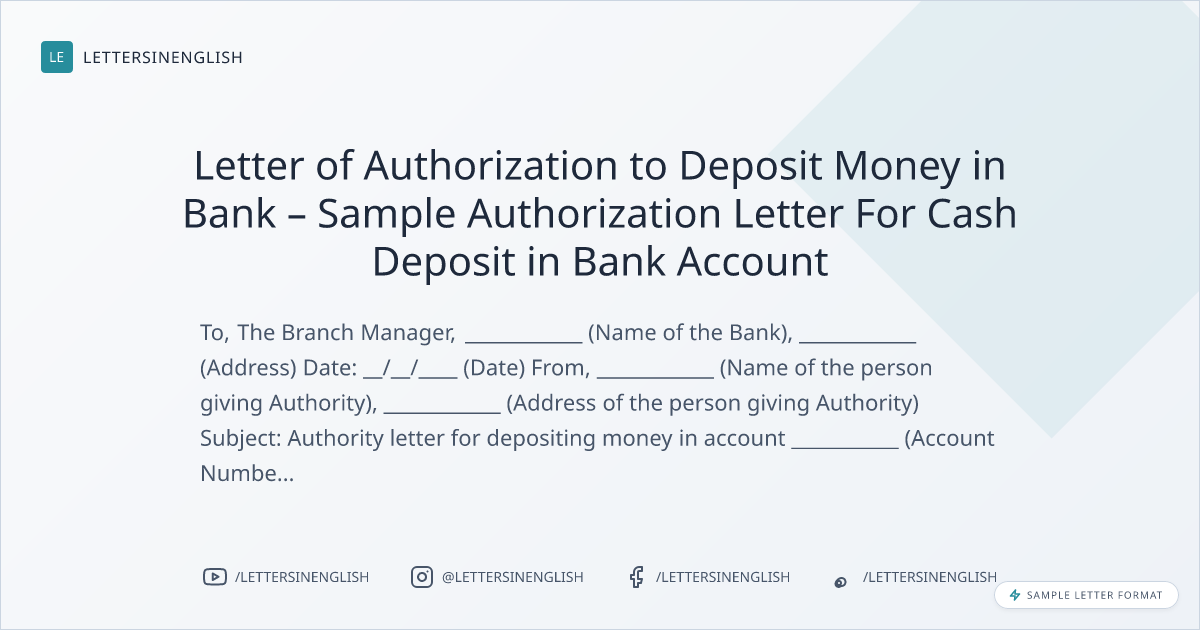 Letter of Authorization to Deposit Money in Bank – Sample Authorization Letter For Cash Deposit in Bank Account