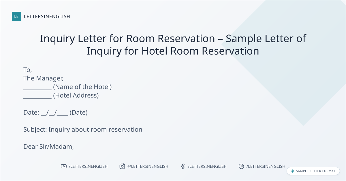 Inquiry Letter for Room Reservation – Sample Letter of Inquiry for Hotel Room Reservation