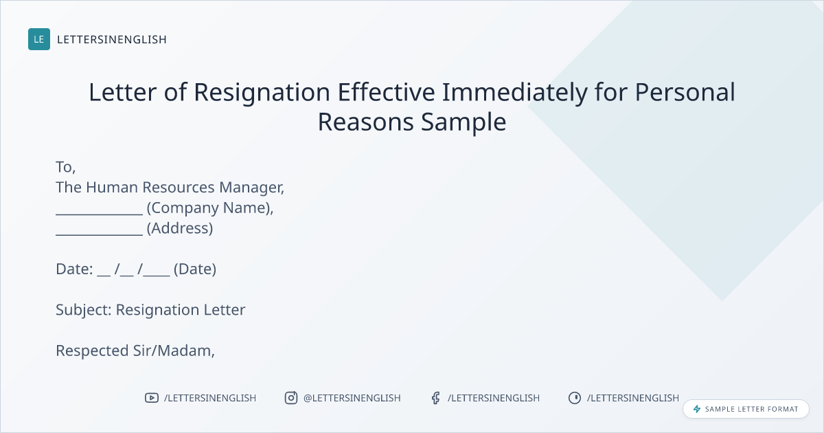 Letter of Resignation Effective Immediately for Personal Reasons Sample