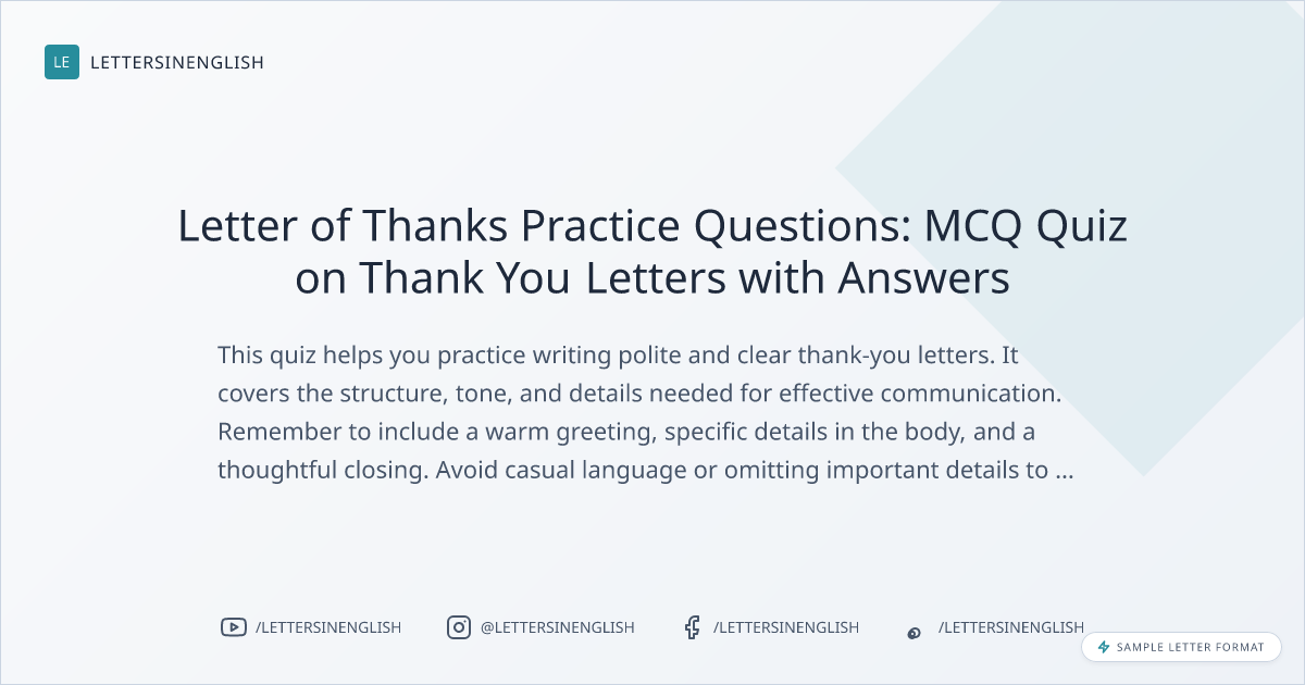 This quiz helps you practice writing polite and clear thank-you letters. It covers the structure, tone, and details needed for effective communication. Remember to include a warm greeting, specific details in the body, and a thoughtful closing. Avoid casual language or omitting important details to ensure your message is clear and respectful.