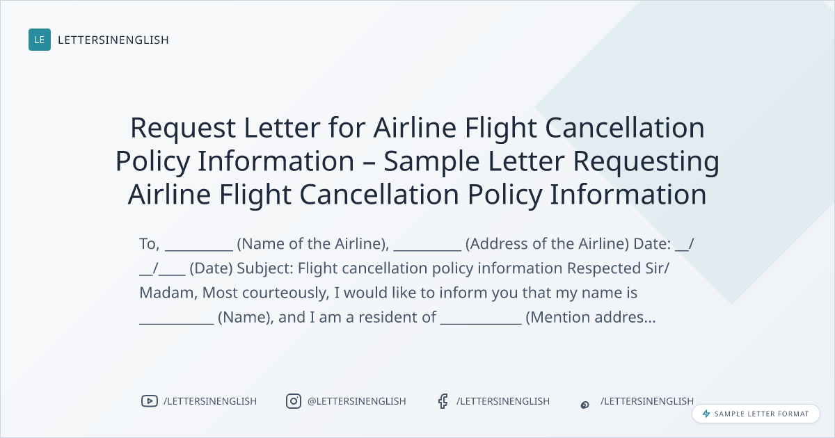 I am writing this letter to request information about the flight cancellation policy of your airline. I require this information for __________ (mention the reason). In this regard, I request you to kindly share the flight cancellation policies with me over email.
