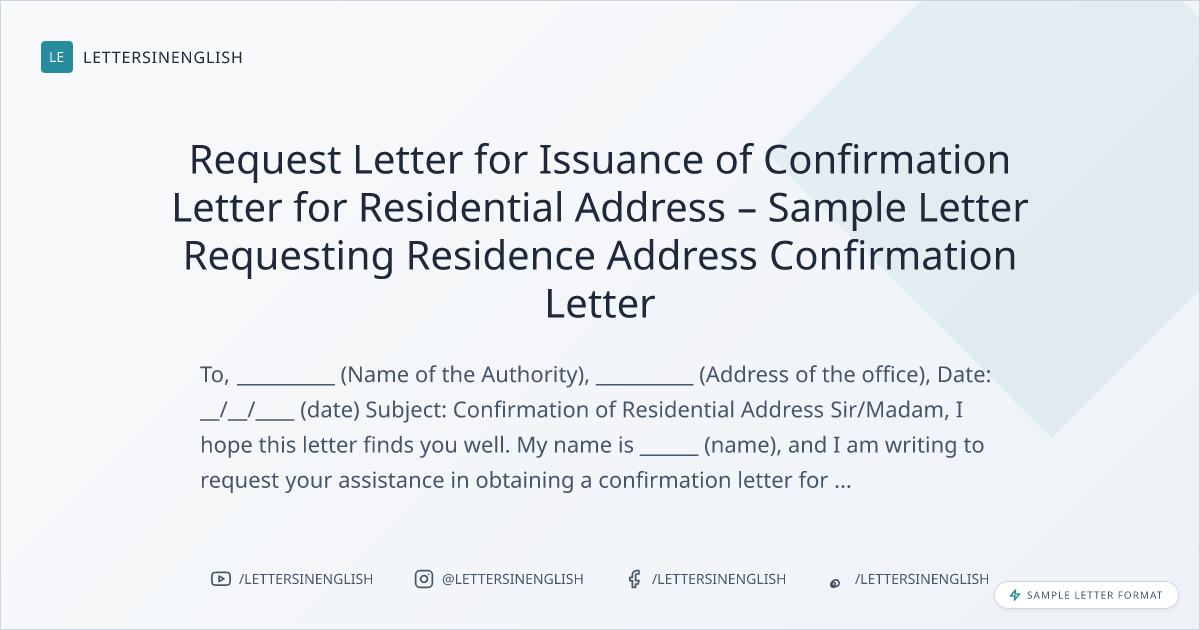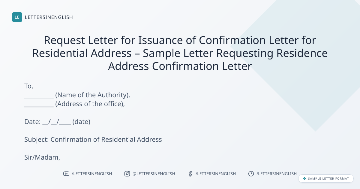Request Letter for Issuance of Confirmation Letter for Residential Address – Sample Letter Requesting Residence Address Confirmation Letter