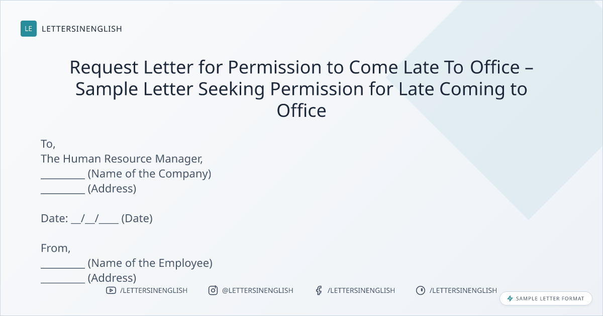 This letter is to seek permission for coming late to the office on __/__/____ (Mention date). I will be late for _________ (Mention time duration – 1 hour/ 2 hour/ 3 hour/any other). The reason for coming late is _________ (Mention Reason- Family problem/ Urgently have to go somewhere/ Doctor appointment in office hours, any other reason).