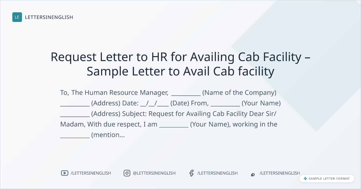 Request Letter to HR for Availing Cab Facility – Sample Letter to Avail Cab facility