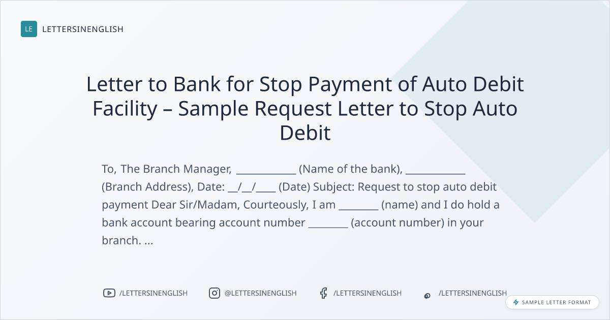 Letter to Bank for Stop Payment of Auto Debit Facility – Sample Request Letter to Stop Auto Debit