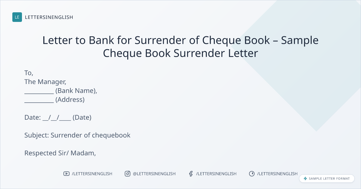 Letter to Bank for Surrender of Cheque Book – Sample Cheque Book Surrender Letter