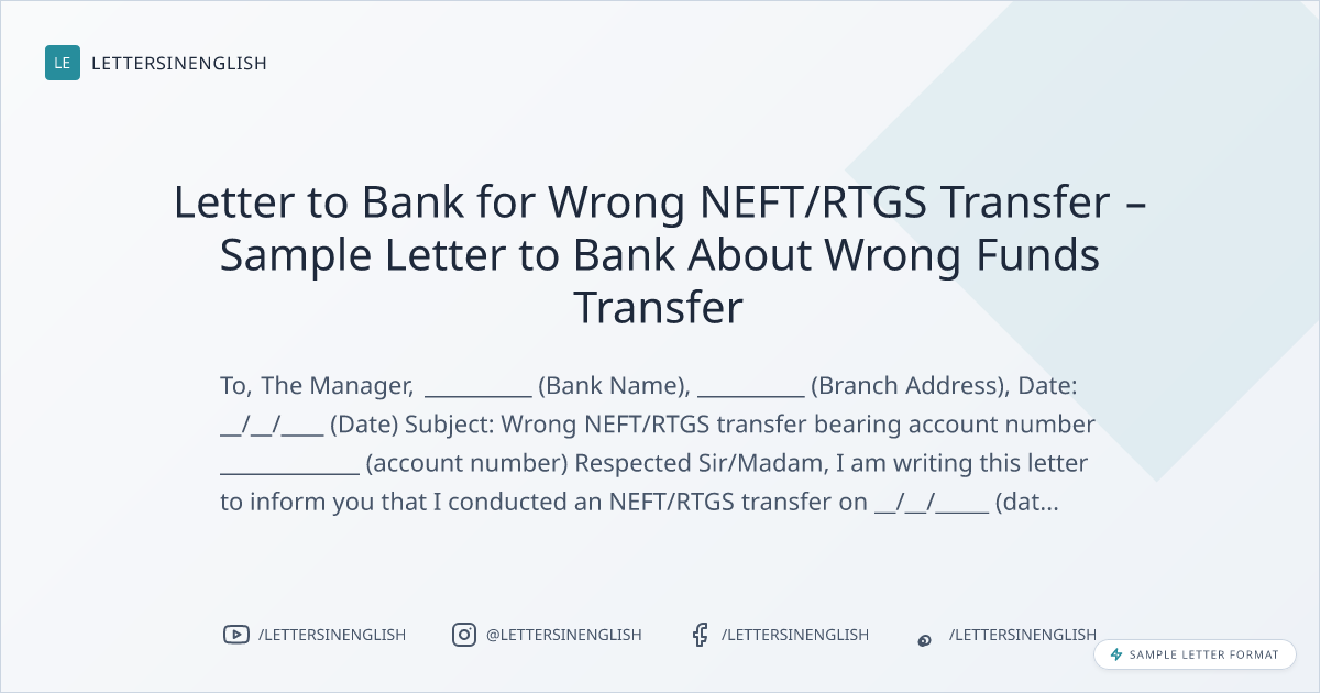 Letter to Bank for Wrong NEFT/RTGS Transfer – Sample Letter to Bank About Wrong Funds Transfer
