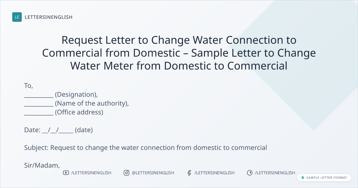 Request Letter to Change Water Connection to Commercial from Domestic – Sample Letter to Change Water Meter from Domestic to Commercial