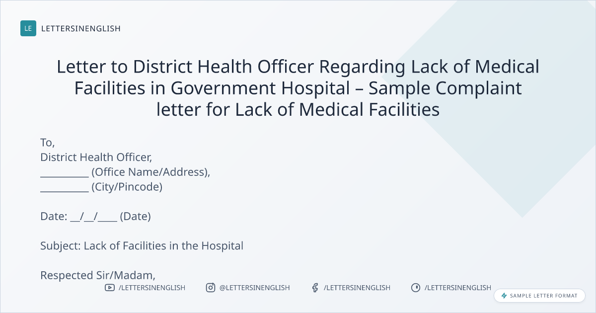 Letter to District Health Officer Regarding Lack of Medical Facilities in Government Hospital – Sample Complaint letter for Lack of Medical Facilities