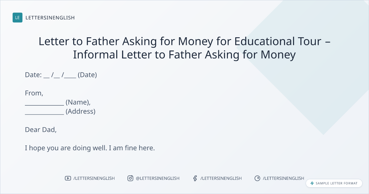 Letter to Father Asking for Money for Educational Tour – Informal Letter to Father Asking for Money