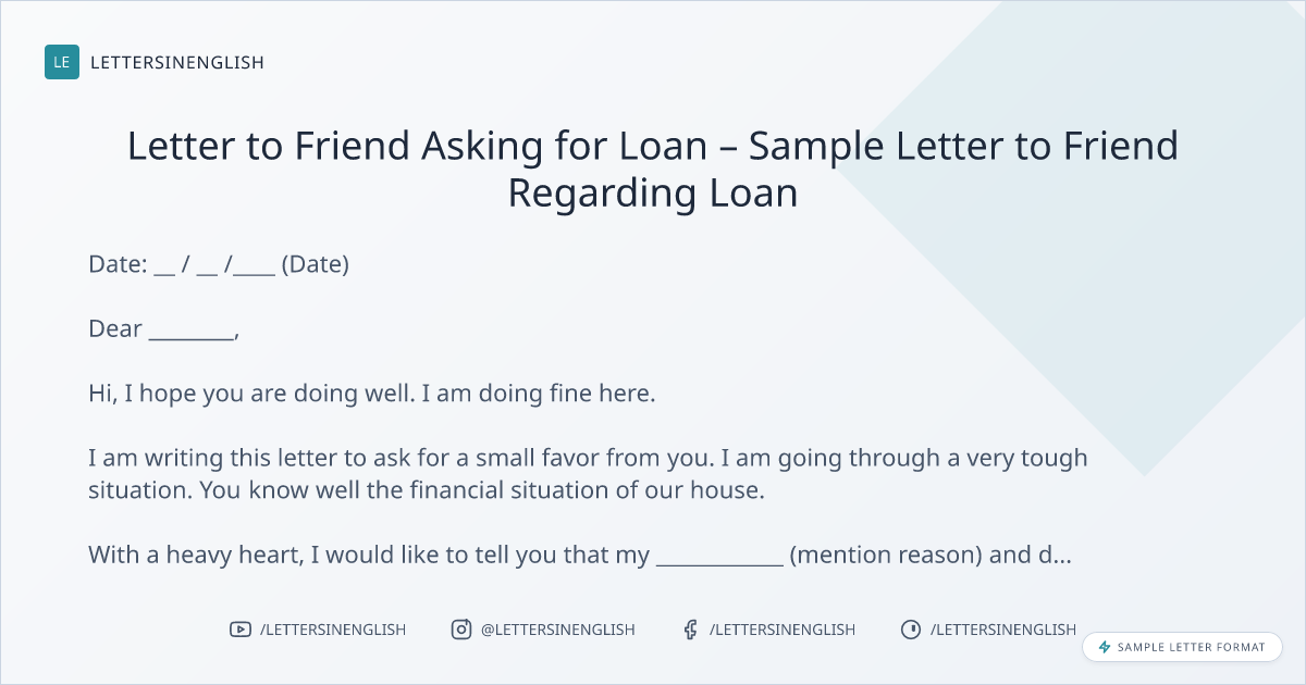 With a heavy heart, I would like to tell you that my ____________ (mention reason) and due to which it is getting difficult for us to survive. I am writing this letter to request you a loan of ________ (loan amount required) so that I can do a _________ (mention details). I promise that I will return it as soon as possible.