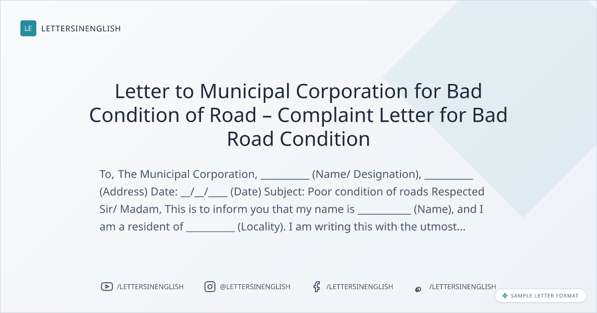 Letter to Municipal Corporation for Bad Condition of Road – Complaint Letter for Bad Road Condition