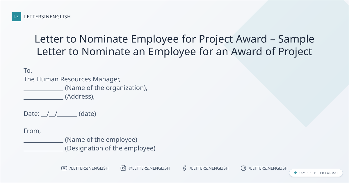 Letter to Nominate Employee for Project Award – Sample Letter to Nominate an Employee for an Award of Project