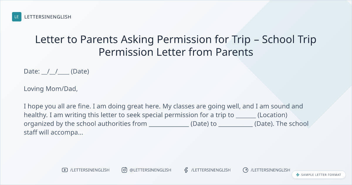 I hope you all are fine. I am doing great here. My classes are going well and I am sound and healthy. I am writing this letter to seek a special permission for a trip to _______ (Location) which is being organized by the school authorities from ______________ (Date) to ____________ (Date). The school staff will be accompanying us. The total cost for the trip will be ______________ (Mention the total cost).