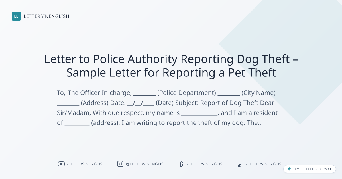 Letter to Police Authority Reporting Dog Theft – Sample Letter for Reporting a Pet Theft