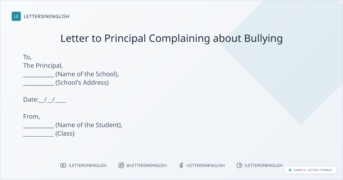 I would like to bring a grievous issue to your concern which I am facing in my class. I am being bullied by my classmates. They make fun of me by _________ (Bullying reason). They also make fun of my _________ (Other bullying reason, if applicable). Moreover, at my back, other students crack jokes on my ________ (if applicable -Mention all the issues)