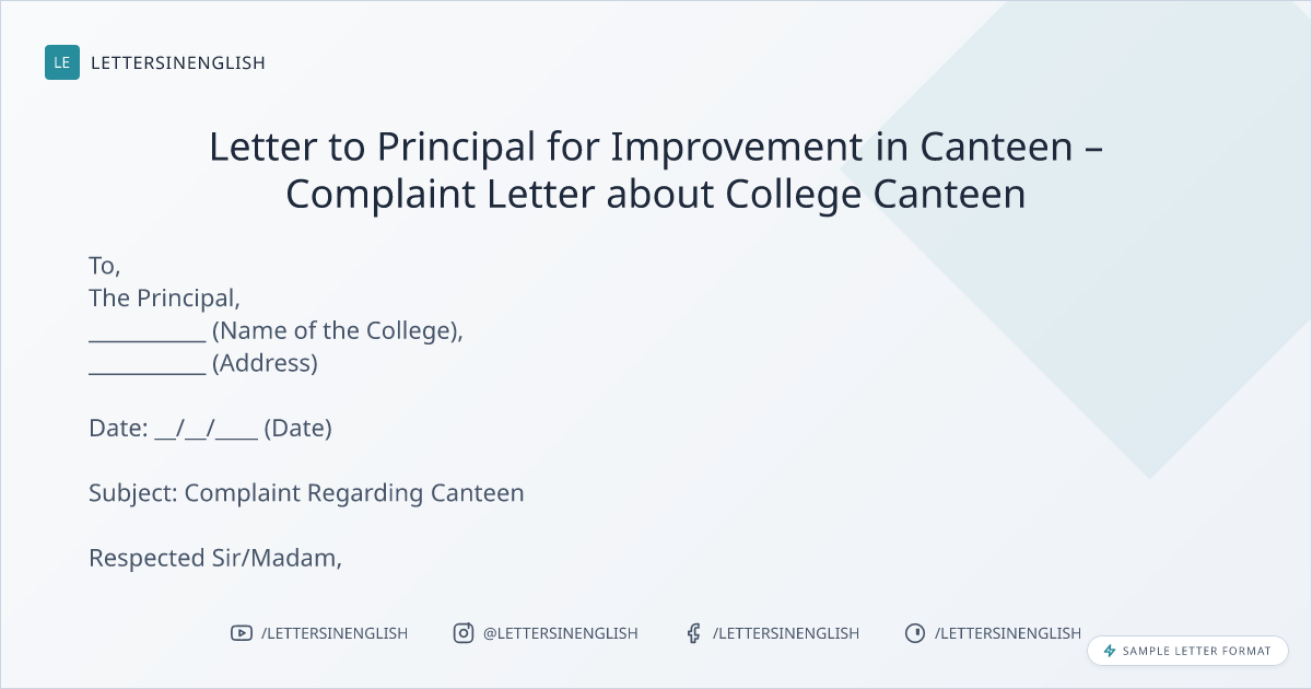 Letter to Principal for Improvement in Canteen – Complaint Letter about College Canteen