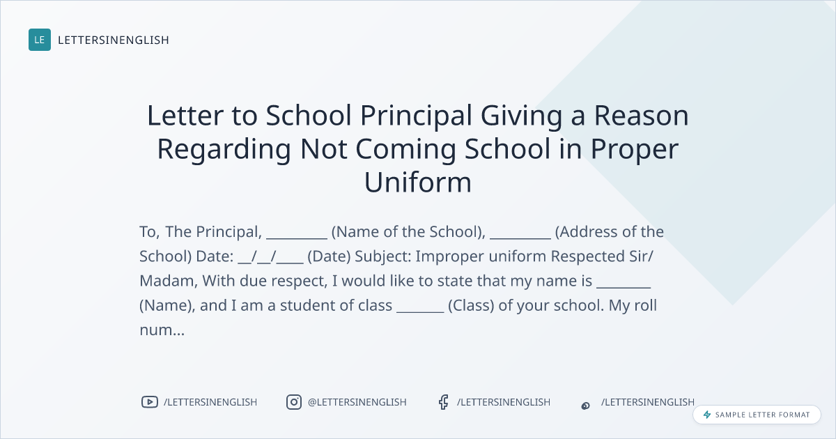 Sample Letter to School Principal Giving a Reason Regarding Not Coming School in Proper Uniform