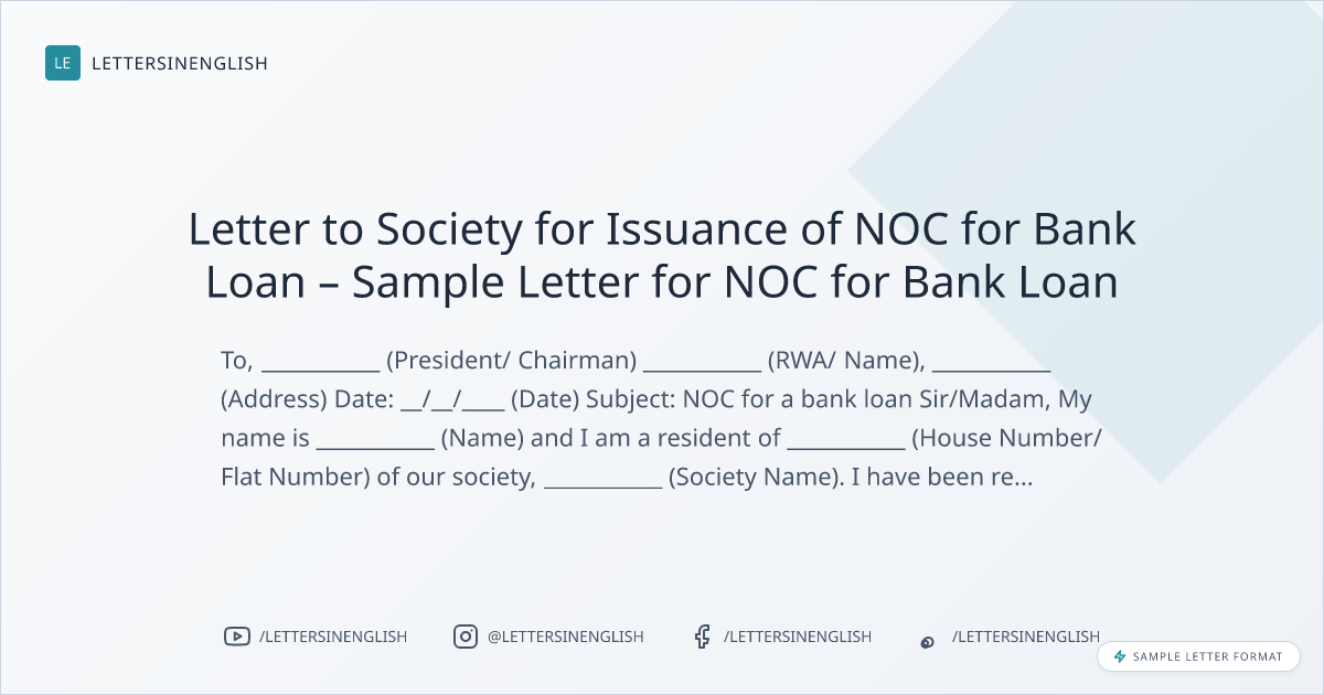 Letter to Society for Issuance of NOC for Bank Loan – Sample Letter for NOC for Bank Loan