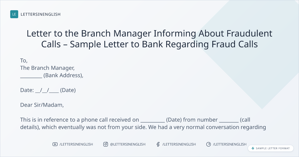Letter to the Branch Manager Informing About Fraudulent Calls – Sample Letter to Bank Regarding Fraud Calls