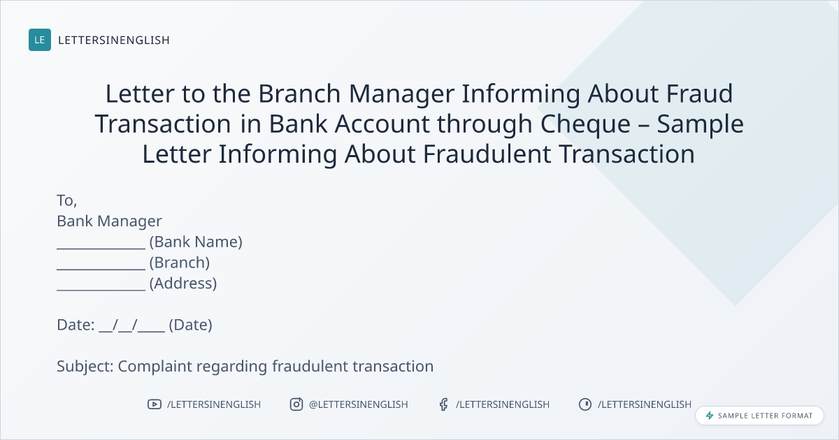 Letter to the Branch Manager Informing About Fraud Transaction in Bank Account through Cheque – Sample Letter Informing About Fraudulent Transaction