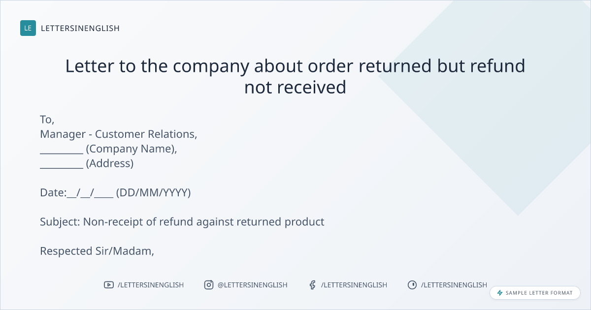 Letter to the company about order returned but refund not received
