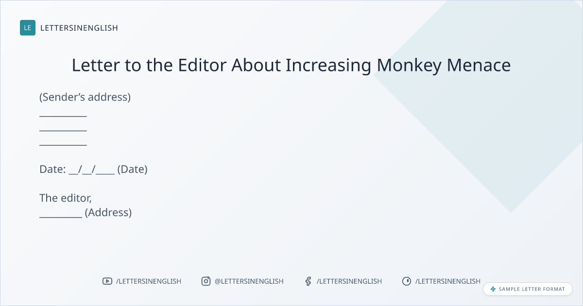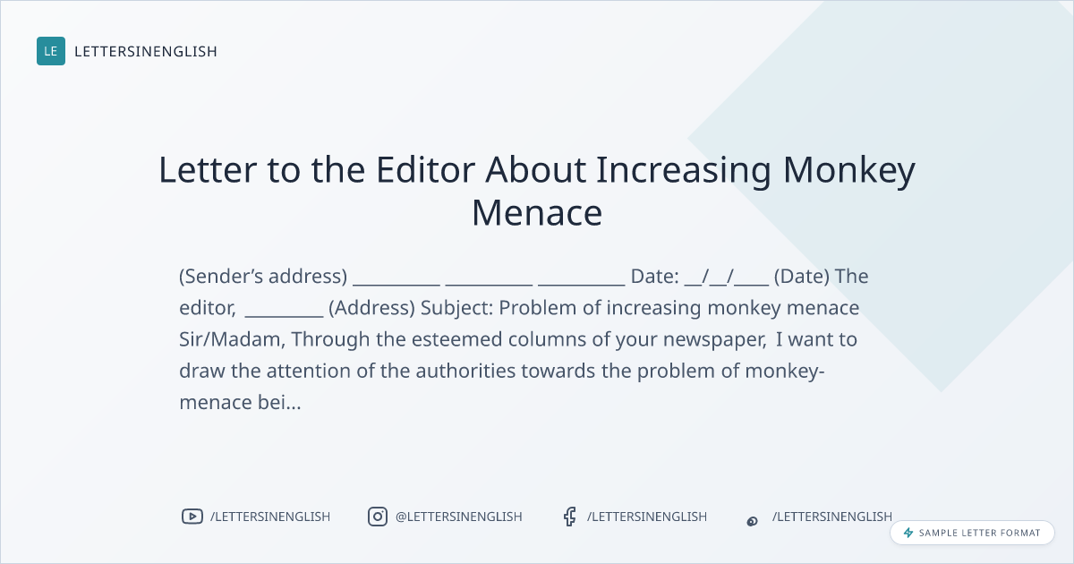 Through the esteemed columns of your newspaper, I want to draw the attention of the authorities towards the problem of monkey-menace being faced by our society for the last _____ (weeks/months). They are everywhere you can imagine – on the walls, balconies, windows, terrace, etc. and they _____ (break the sand pots / the plant / tear off clothes/any other issue) and once they even dared to enter a house and robbed off all the fruits and vegetables.