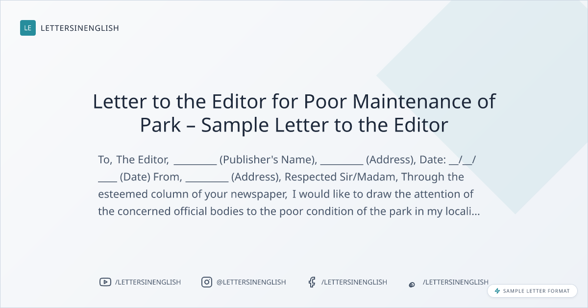 Letter to the Editor for Poor Maintenance of Park – Sample Letter to the Editor