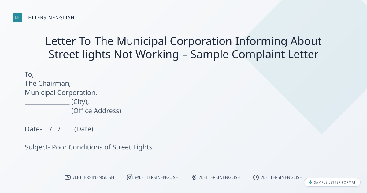 Letter To The Municipal Corporation Informing About Street lights Not Working – Sample Complaint Letter
