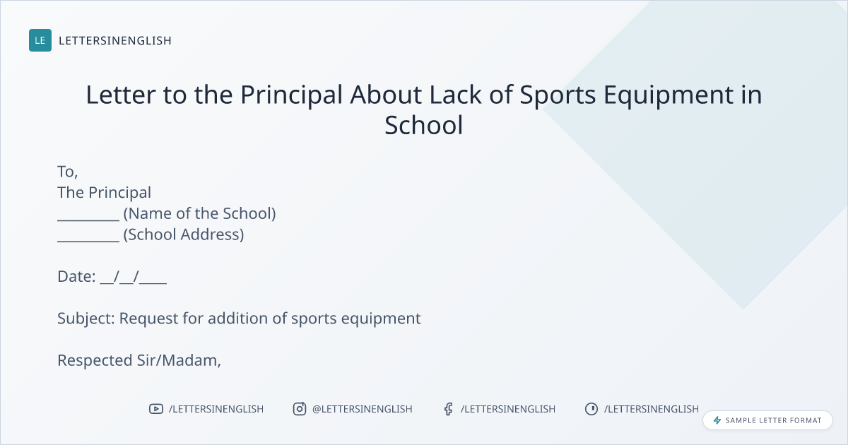 I would like to bring in your notice the lack of sports equipment in our school. Our school is a prominent name in the district/state, the old and torn equipment may tarnish the school’s image in upcoming sports events.