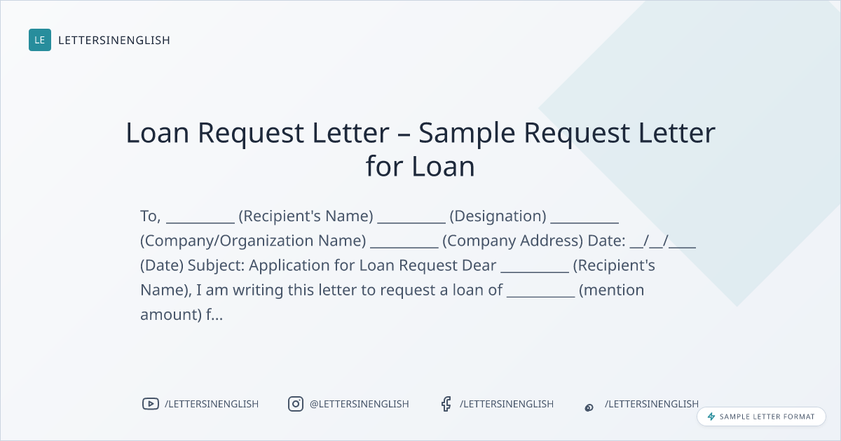 I am writing this letter to request a loan of __________ (mention amount) from __________ (Company/Bank/Organization Name). I am currently working as a __________ (Your Designation) and have been associated with your organization for the past __________ (mention duration).