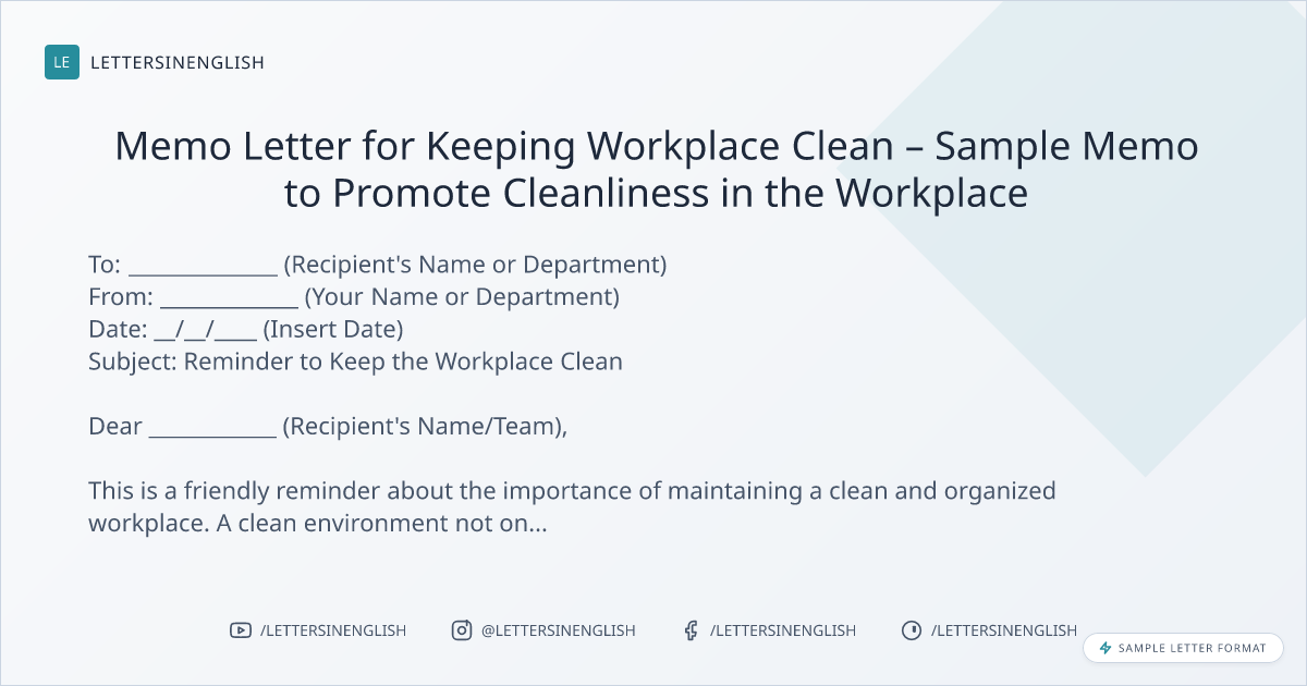 Memo Letter to Encourage Cleanliness at the Workplace - Sample Memo for Promoting a Clean and Tidy Workplace