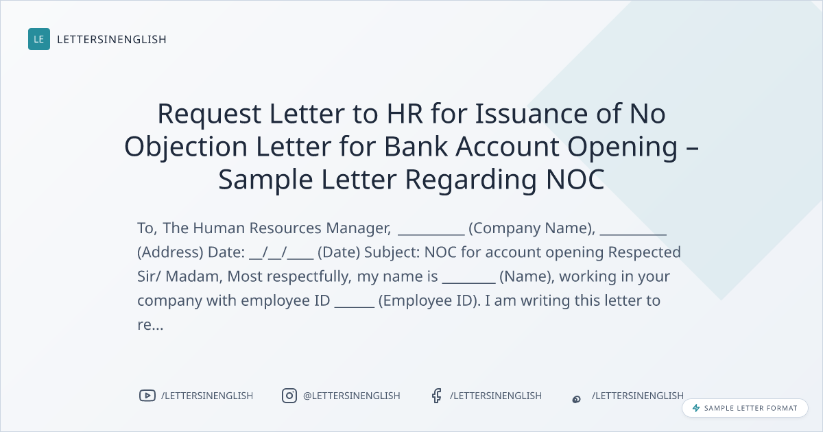 Request Letter to HR for Issuance of No Objection Letter for Bank Account Opening – Sample Letter Regarding NOC