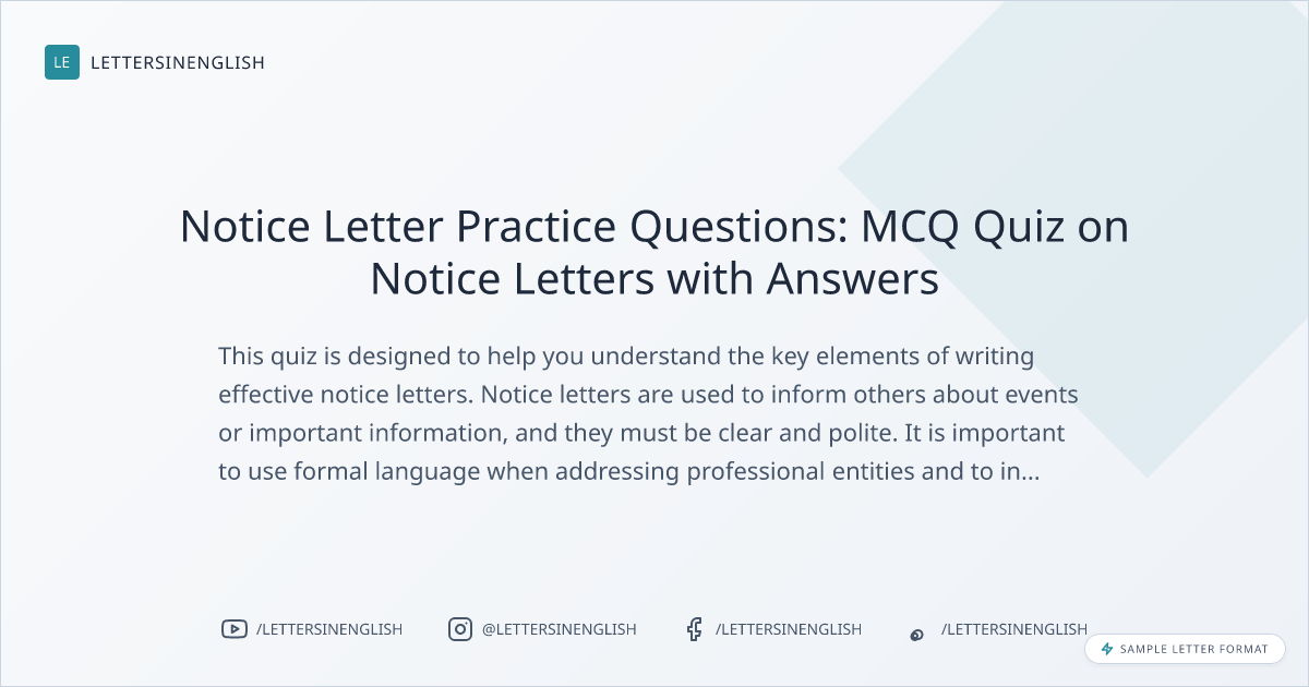 This quiz is designed to help you understand the key elements of writing effective notice letters. Notice letters are used to inform others about events or important information, and they must be clear and polite. It is important to use formal language when addressing professional entities and to include necessary details, such as dates and specific actions. Avoid long paragraphs, unnecessary details, and informal language. Always proofread your letter before sending it to make sure the message is clear and accurate. By following these tips, you can write notice letters that are easy to understand and professional.