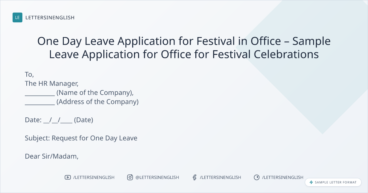 One Day Leave Application for Festival in Office – Sample Leave Application for Office for Festival Celebrations