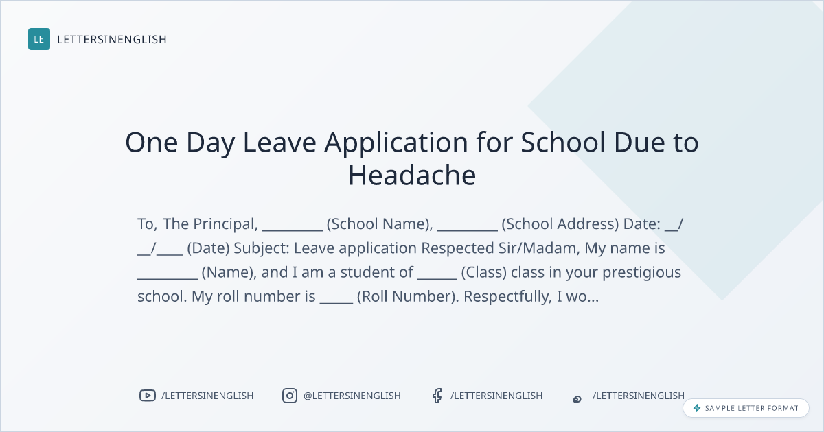 When writing a leave application for school due to a headache, it's important to maintain clarity and politeness. Clearly state your name, class, and roll number. Specify the reason for your absence and the date you'll be absent. Request the principal to consider your reason and grant you sick leave. Express gratitude for their understanding. Avoid using unclear language and ensure all necessary details are included for the principal to process your request efficiently.