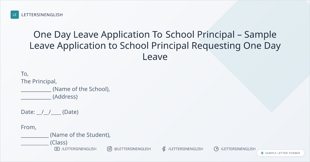 One Day Leave Application To School Principal – Sample Leave Application to School Principal Requesting One Day Leave