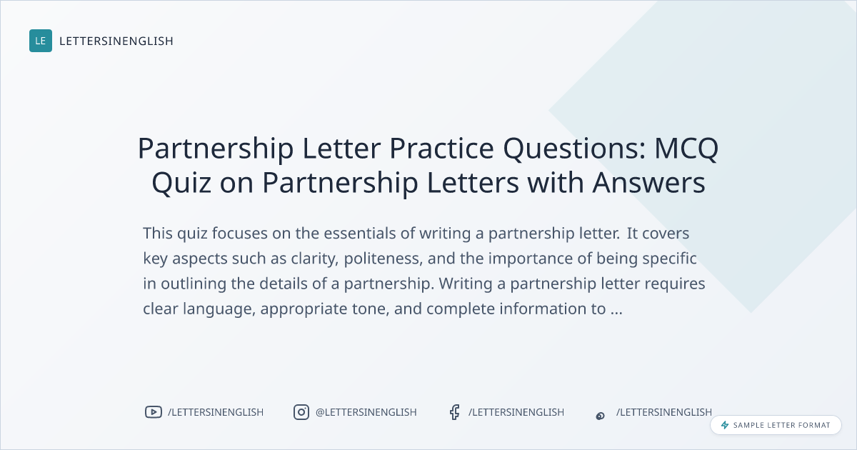 This quiz focuses on the essentials of writing a partnership letter. It covers key aspects such as clarity, politeness, and the importance of being specific in outlining the details of a partnership. Writing a partnership letter requires clear language, appropriate tone, and complete information to avoid confusion or misunderstandings. Avoid using overly complicated or vague language and ensure all necessary details are included to make the letter effective.