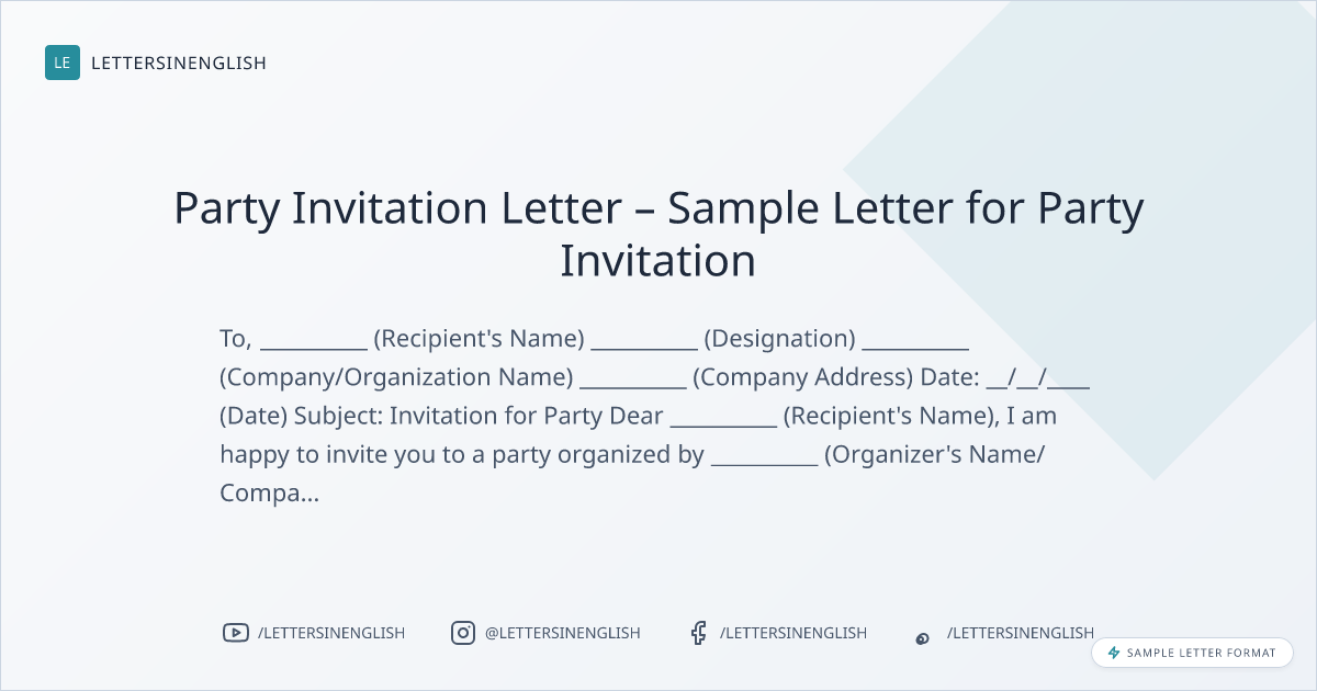 I am happy to invite you to a party organized by __________ (Organizer’s Name/Company Name), which will be held on __________ (Date) at __________ (Venue/Location).