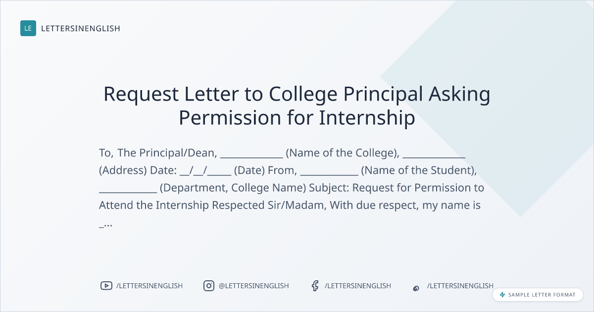 I am writing this letter to request permission for attending an internship. I recently got selected for _____________ (Name of the Internship) by ____________ (Name of the Organization). The timings of the internship are ________________ (Mention the timings with days).