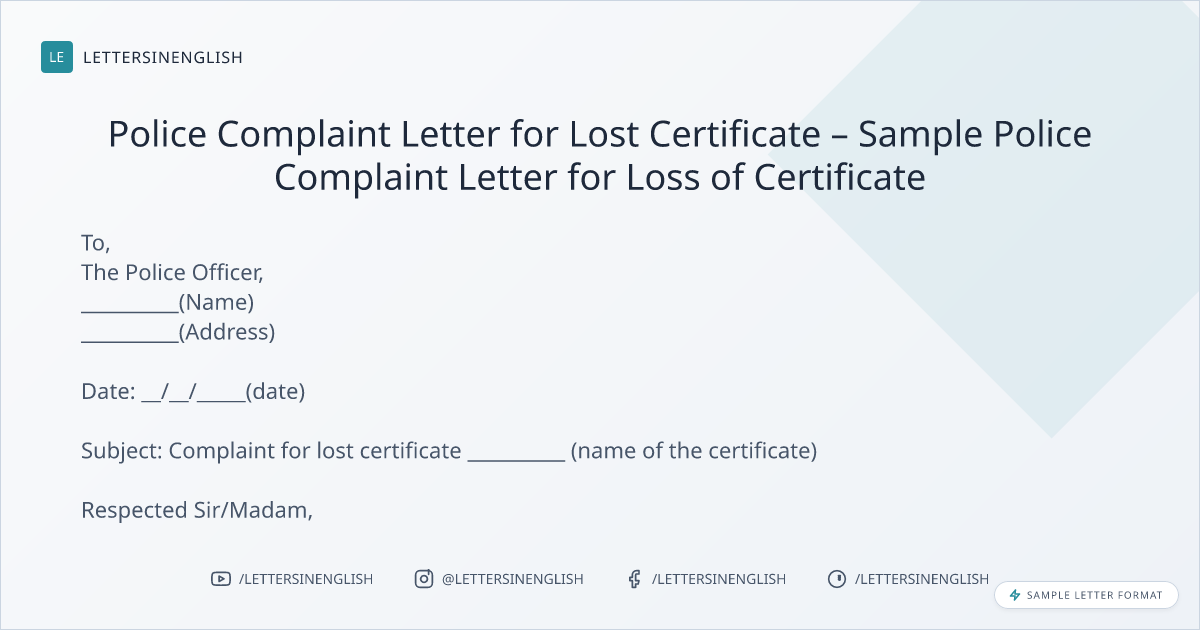 Police Complaint Letter for Lost Certificate – Sample Police Complaint Letter for Loss of Certificate