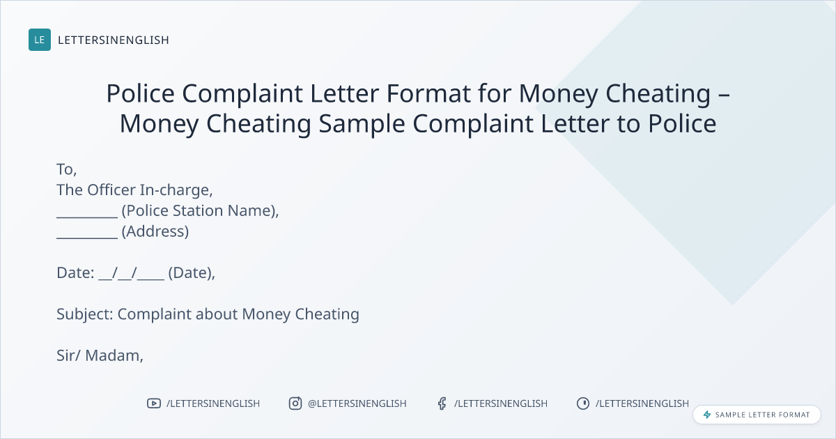 Police Complaint Letter Format for Money Cheating – Money Cheating Sample Complaint Letter to Police