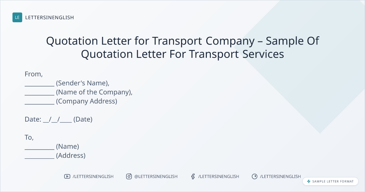 Courteously, my name is __________ (Your Name), the transport executive of __________ (Name of the Company). I am writing this letter regarding the quotation for the transport services you applied on __________ (Date) for item __________ (Mention item/ items to be transported), which is to be transported from __________ (Mention Place/ Location/ Locality) at __________ (Time), to __________ (Mention Place/ Location/ Locality).